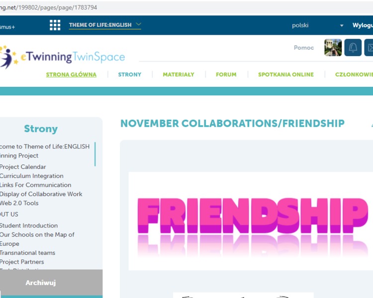 Zadania listopadowe dotyczyły przyjaźni. Na padlecie „Friendship Wall” uczniowie zamieścili swoje definicje i opinie o przyjaźni. Dołączali także zdjęcia z przyjaciółmi. Tworzyli też tzw. quotes, czyli powiedzenia związane z przyjaźnią wykorzystując stronę Quozio. Wykazali się wiedzą językową i pomysłowością projektując prace na narzędziu Canva. A to dopiero początek projektu! Wszystko przed nami J