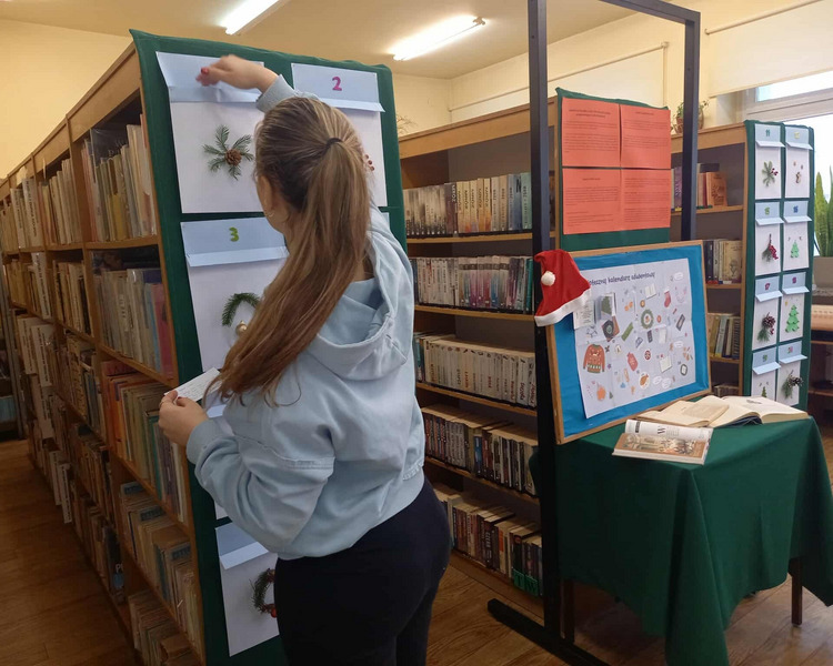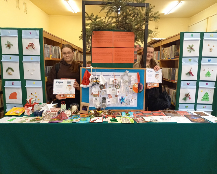 Od 1 do 23 grudnia 2025 roku w bibliotece szkolnej trwała akcja "Biblioteczny kalendarz adwentowy". Codziennie, podczas pierwszej przerwy lekcyjnej, otwierane było okienko z zadaniem na dany dzień. Kalendarz cieszył się dużym zainteresowaniem. W realizację zadań włączyło się 50 uczniów. Uczestnicy zostali nagrodzeni słodkim upominkiem, a Ci, którzy wykonali wszystkie zadania, zostali nagrodzeni dyplomami i książkami. Prace wykonane w ramach realizacji zadań m.in. ozdoby na choinkę, stroiki, kartki świąteczne, opakowania na prezenty przyozdobiły bibliotekę, wprowadzając świąteczny klimat.