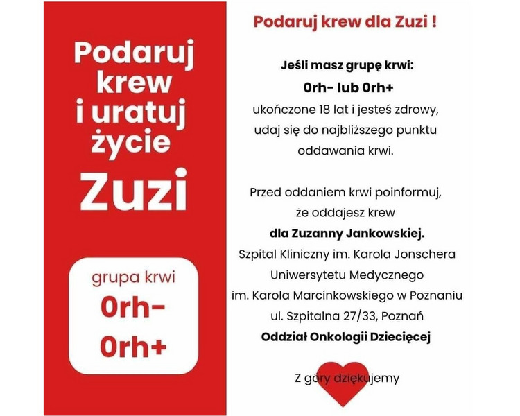 Uczennica naszej szkoły, tegoroczna maturzystka Zuzia Jankowska potrzebuje Waszej pomocy. U Zuzi jakiś czas temu zdiagnozowano nowotwór – Chłoniaka. Pilnie potrzebna jest krew i środki na leczenie.