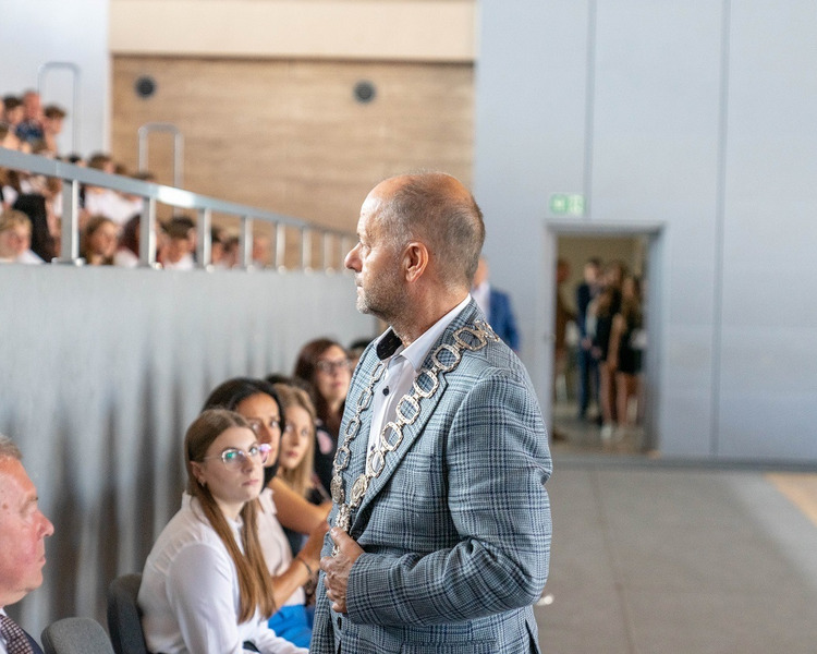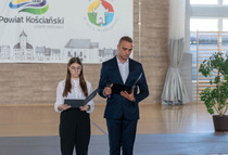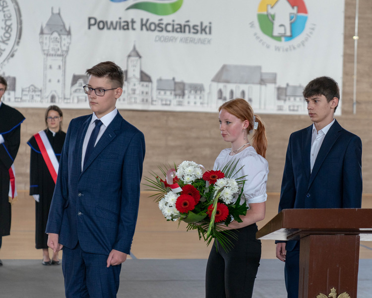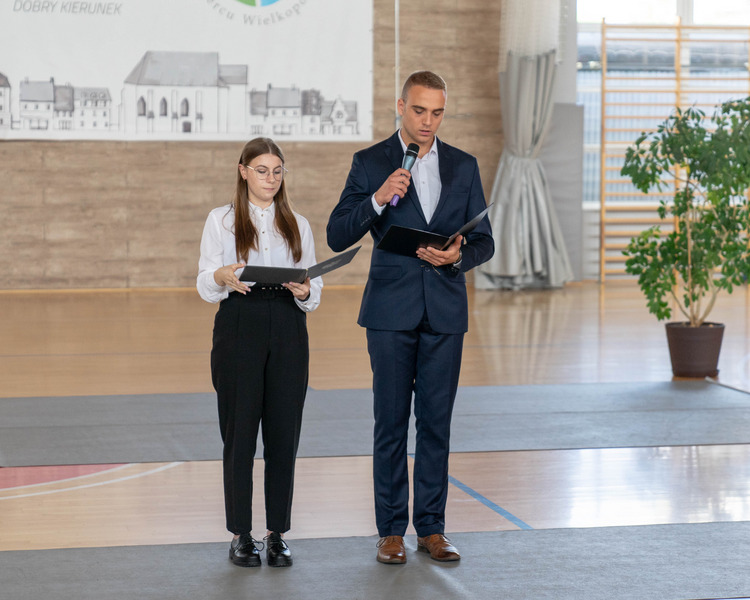 Wszystkich serdecznie przywitała Dyrektor Zespołu Szkół Ponadpodstawowych im. Franciszka Ratajczaka, Pani Małgorzata Durek, zarówno: kierownictwo szkoły, zaproszonych gości: Karola Pawlaka, Mariana Kurasiaka i Dawida Kaźmierczaka z Powiatowego Cechu Rzemiosła i Przedsiębiorczości w Kościanie, rodziców, grono pedagogiczne z pracownikami, przedstawicieli mediów, zgromadzoną młodzież, a szczególnie uczniów klas pierwszych.