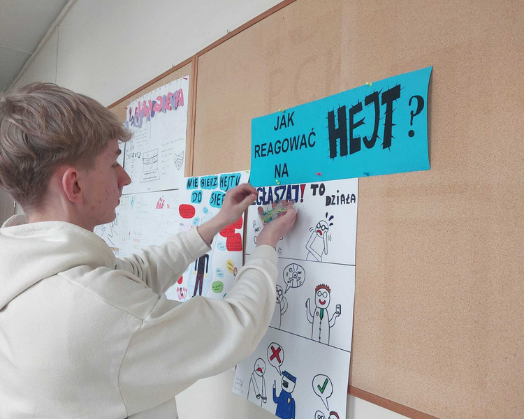 Uczniowie klasy 4TKM i 2LO brali udział w lekcji on-line realizowanej w ramach projektu edukacyjnego BAKCYL: „Cyberbezpieczeństwo”. Na podstawie zdobytej wiedzy, młodzież kształcąca się w zawodzie technika rachunkowości, rozwiązywała zagadki cyberbezpieczeństwa w grach edukacyjnych (SPOOFY GAME, ESCAPE ROOM DBI 2025) oraz przygotowała plakaty na temat: „Jak reagować na hejt?”. Przygotowane plakaty zostały rozwieszone na szkolnych korytarzach, aby zwrócić uwagę społeczności Ratajczaka na problemy wynikające z nieodpowiedniego korzystania z Internetu.