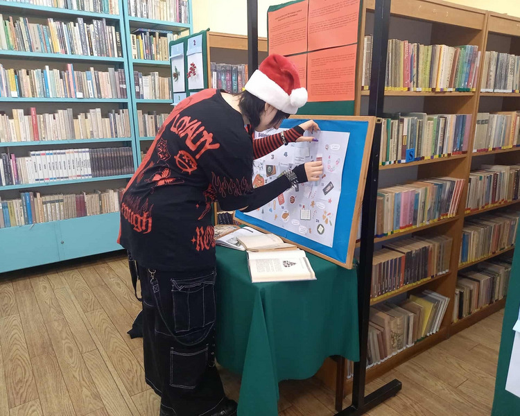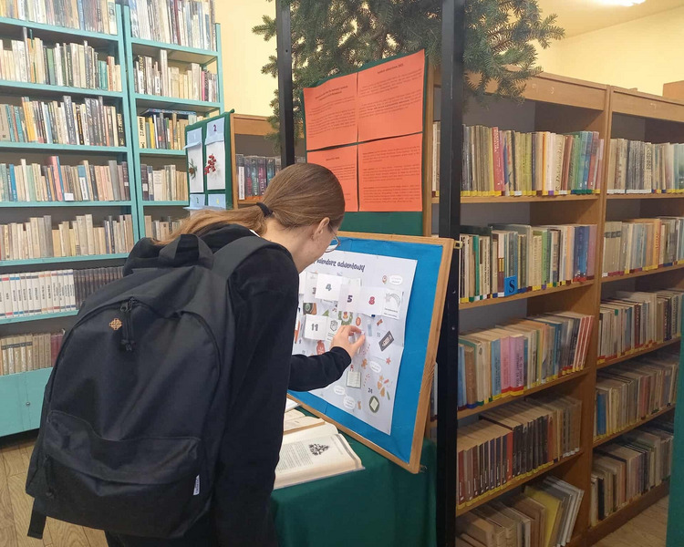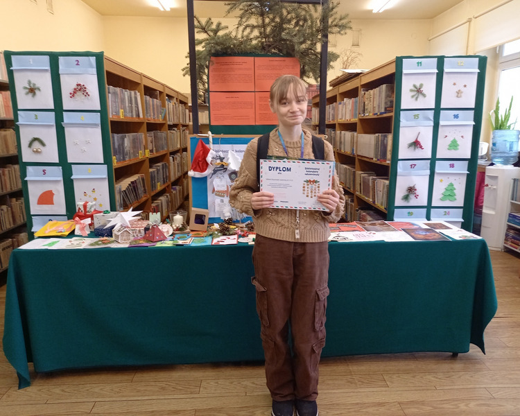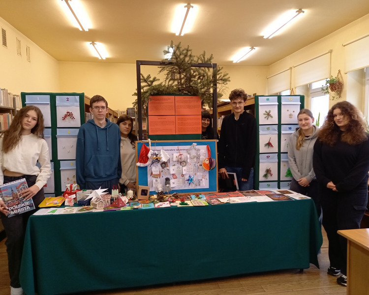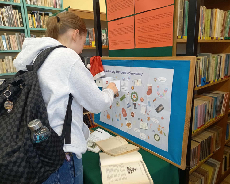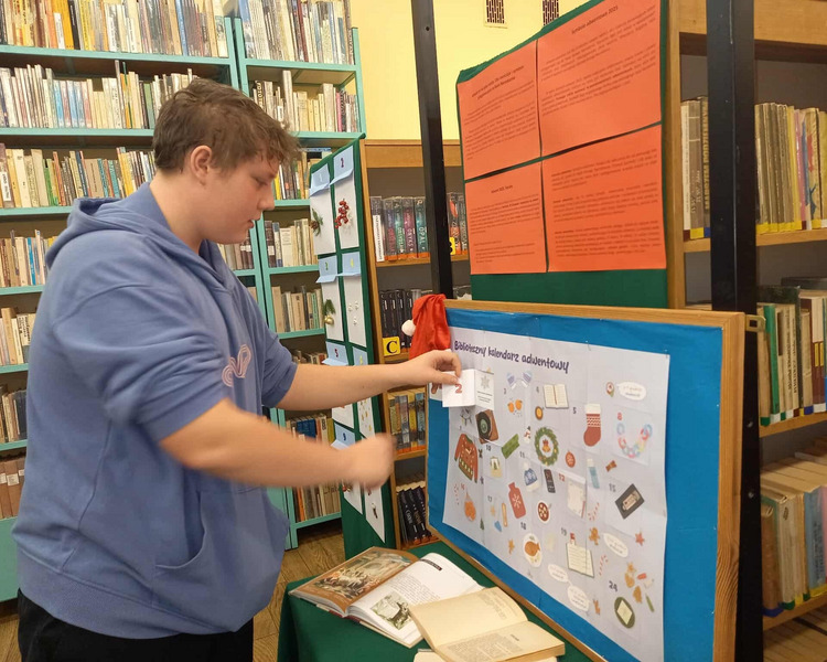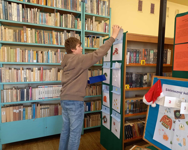 Od 1 do 23 grudnia 2025 roku w bibliotece szkolnej trwała akcja "Biblioteczny kalendarz adwentowy". Codziennie, podczas pierwszej przerwy lekcyjnej, otwierane było okienko z zadaniem na dany dzień. Kalendarz cieszył się dużym zainteresowaniem. W realizację zadań włączyło się 50 uczniów. Uczestnicy zostali nagrodzeni słodkim upominkiem, a Ci, którzy wykonali wszystkie zadania, zostali nagrodzeni dyplomami i książkami. Prace wykonane w ramach realizacji zadań m.in. ozdoby na choinkę, stroiki, kartki świąteczne, opakowania na prezenty przyozdobiły bibliotekę, wprowadzając świąteczny klimat.